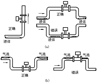 VSF可安裝在室內或室外。如果安裝在地井里,有水淹的可能,要選用涎水型傳感器。傳感器在管道上可以水平、垂直或傾斜安裝,但測量液體和氣體時為防止氣泡和液滴的干擾,安裝位置要注意,如圖16所示。