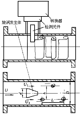 在流體中設置旋渦發(fā)生體(阻流體),從旋渦發(fā)生體兩側交替地產生有規(guī)則的旋渦,這種旋渦稱為卡曼渦街,如圖1所示。旋渦列在旋渦發(fā)生體下游非對稱地排列。設旋渦的發(fā)生頻率為f,被測介質來流的平均速度為U,旋渦發(fā)生體迎面寬度為d,表體通徑為D,根據卡曼渦街原理,有如下關系式
