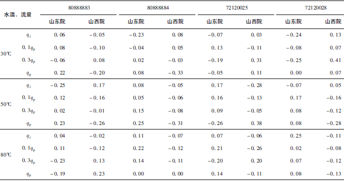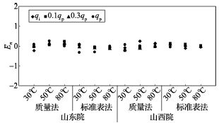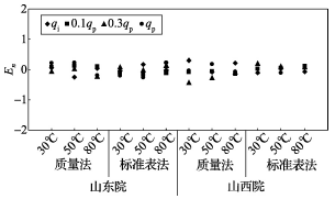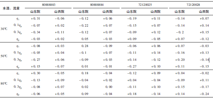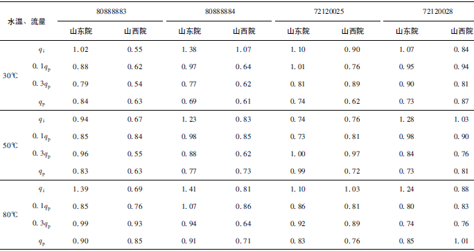 (2)累積體積(質(zhì)量法)相對示值誤差測量結(jié)果中,山東院在水溫80℃、qi點處與參考值的差值最大,為+0.31%(72120025);山西院在水溫30℃、0.3qp點處與參考值的差值最大,為+0.36%(72120028)。由于比對樣品在一些試驗點上的測量重復(fù)性不是很好,差值的擴展不確定度最大達到了1.35%。