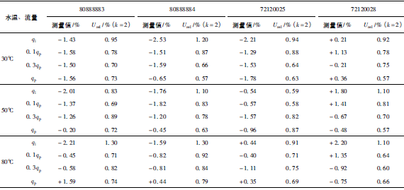 (3)累積體積(標準表法)相對示值誤差測量結(jié)果中,山東院在水溫30℃、qi點處與參考值的差值最大,為+0.31%(80888883);山西院在水溫80℃、qp點處與參考值的差值最大,為-0.24%(72120028)。同樣在標準表法中比對樣品在一些試驗點上的測量重復(fù)性也不是很好,差值的擴展不確定度最大達到了1.41%。