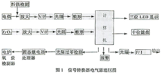 將來自氧量檢測(cè)器的模擬信號(hào)(氧勢(shì)、熱電勢(shì))分別調(diào)制成0-10KNz調(diào)頻信號(hào),經(jīng)光電隔離后送至計(jì)算機(jī),采用調(diào)頻方式能將儀表輸入、輸出相互隔離,這樣就消除了諸如大電流跳變所引起的干擾,能夠克服高共模電壓,因而大大提高了儀表的抗干擾能力。應(yīng)用程序主要由主程序和子程序組成,所有的程序都采用模塊結(jié)構(gòu)編制,便于修改、增加軟件功能,以滿足不同用戶的特殊需要。程序運(yùn)算采用了三位浮點(diǎn)數(shù),保證了運(yùn)算勞動(dòng)精度,對(duì)氧濃、爐溫的計(jì)算,采用查表線性插值法,對(duì)爐溫的控制采用增量式PID算式控制。信號(hào)轉(zhuǎn)換器的電氣原理框圖見圖1