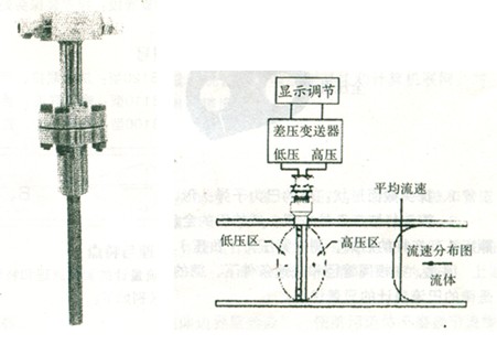 威力巴流量計是一種插入式流量測量儀表。在管道中插入一根威力巴傳感器 ,傳感器在高、低壓區有按一定規則排列的多對 一般為三對取壓孔。分別測量流體的全壓力包括靜壓力和平均速度壓力Pl和靜壓力P2。將P1和P2 分別引入差壓變送器 , 測量出差壓 △P=P1-P2, △P反映流體平均速度的大小 , 以此可推算出流體的流量。
