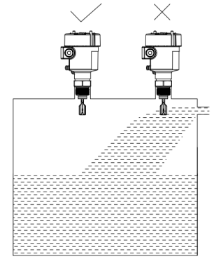 如圖2,選擇音叉液位開關(guān)的安裝位置時(shí),應(yīng)避免由于安裝在入料口位置而造成的測(cè)量誤差,甚至損壞儀表。